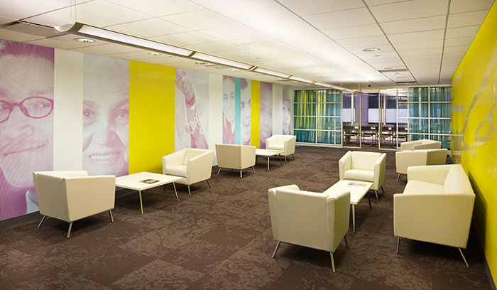Poulin + Morris was commissioned to design an environmental graphics program to further brand, as well as enhance, their newly renovated corporate offices located in midtown Manhattan. A series of wall murals located throughout the public spaces evoke the human spirit that thrives within JBFCS by allowing the viewer to literally come ‘face to face’ with the JBFCS community. The murals are composed of multiple portraits of individuals, made up of over-scaled CMYK-colored halftone dots that create an optical, textural visual dynamic that celebrates the rich diversity of the community it serves. The program relies upon a color palette culled from an interiors palette developed by the project architect, BKSK Architects.