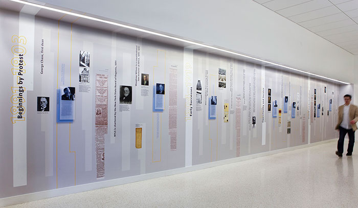 Levels three and four of the new building host an expansive chronologically-organized timeline which traces the School’s history from 1891 to the present, highlighting significant events. Each event is presented as an individual vignette, communicating a specific story on a core value with related layers of historical information and data. Images and narrative text chronicle the School’s history as well as the accomplishments of distinguished alumni. The layering of images, text, and graphics coupled with bold colors create a seamless, unified exhibition experience integrated throughout the public spaces of the building.