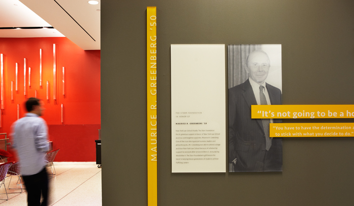Upon entering the lobby, visitors are greeted with a mural honoring Maurice Greenberg, an esteemed alumnus and generous supporter of the School. The mural includes a portrait of Greenberg and a brief biography of the School’s chairman and successful CEO. A commanding graphic element consisting of bold yellow, horizontal bars contain notable quotes by Greenberg illustrating the indelible impact his experiences at the School have made on him.