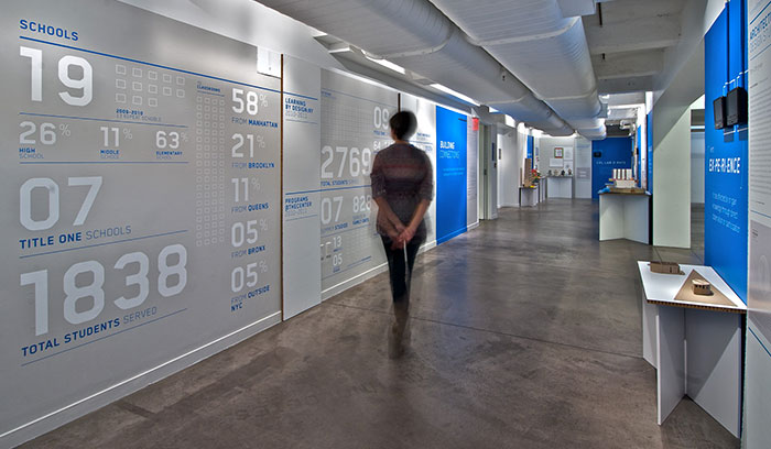 A bold blue, grey, and white typographic wall mural, located at the entrance to the exhibition, functions as a thematic introduction for Building Connections 2011 by presenting the visitor with large-scale numerical data culled from the 2011 program, such as the number of students served, schools participating, models built, and educators involved.