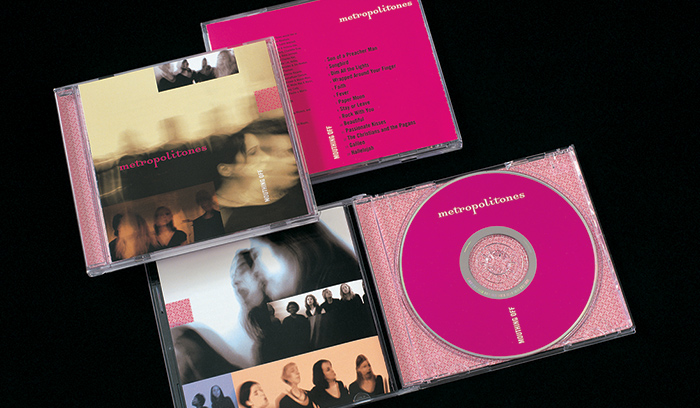 This comprehensive branding program includes CD packaging and related print media celebrating the collaborative nature of this a capella group. The end result reflects the diversity of the group and their shared love of music and a capella through the use of color, pattern, and photography. A bright magenta background, as well as a distinctive, lace-like typographic pattern created from interlocking M’s, is provocative, feminine, and non-traditional. Composition and cropping of group portraits photographed by the designers reinforces the essence of the Metropolitones; blurred and overlapping images evoke unity, energy, and connection between the singers.